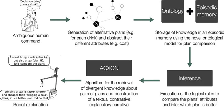 Mutual understanding of artificial agents’ decisions is key to ensuring a trustworthy and successful human-robot interaction. Hence, robots are expected to make reasonable decisions and communicate them to humans when needed. In this article, the focus is on an approach to modeling and reasoning about the comparison of two competing plans, so that robots can later explain the divergent result. First, a novel ontological model is proposed to formalize and reason about the differences between competing plans, enabling the classification of the most appropriate one (e.g., the shortest, the safest, the closest to human preferences, etc.). This work also investigates the limitations of a baseline algorithm for ontology-based explanatory narration. To address these limitations, a novel algorithm is presented, leveraging divergent knowledge between plans and facilitating the construction of contrastive narratives. Through empirical evaluation, it is observed that the explanations excel beyond the baseline method.